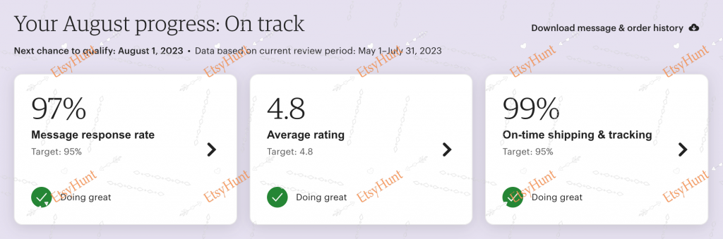 Sellers who meet the criteria for some but not all of the areas will receive individual customer service badges for message response rate, on-time shipping, and ratings average. These badges will also appear on their shop homepage and listings.
