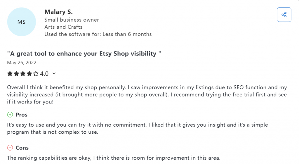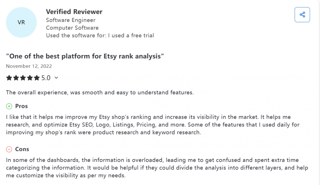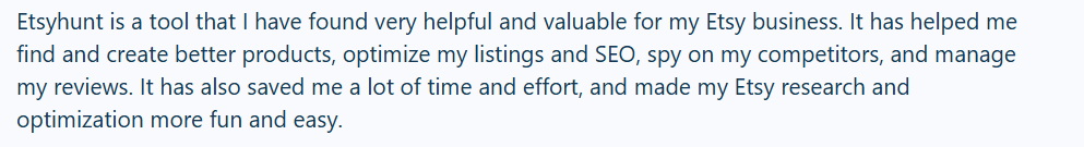 Another user from Capterra said that EHunt helped improve Etsy shop’s ranking and increase visibility in the market, but the EHunt dashboard feels a bit information-heavy.