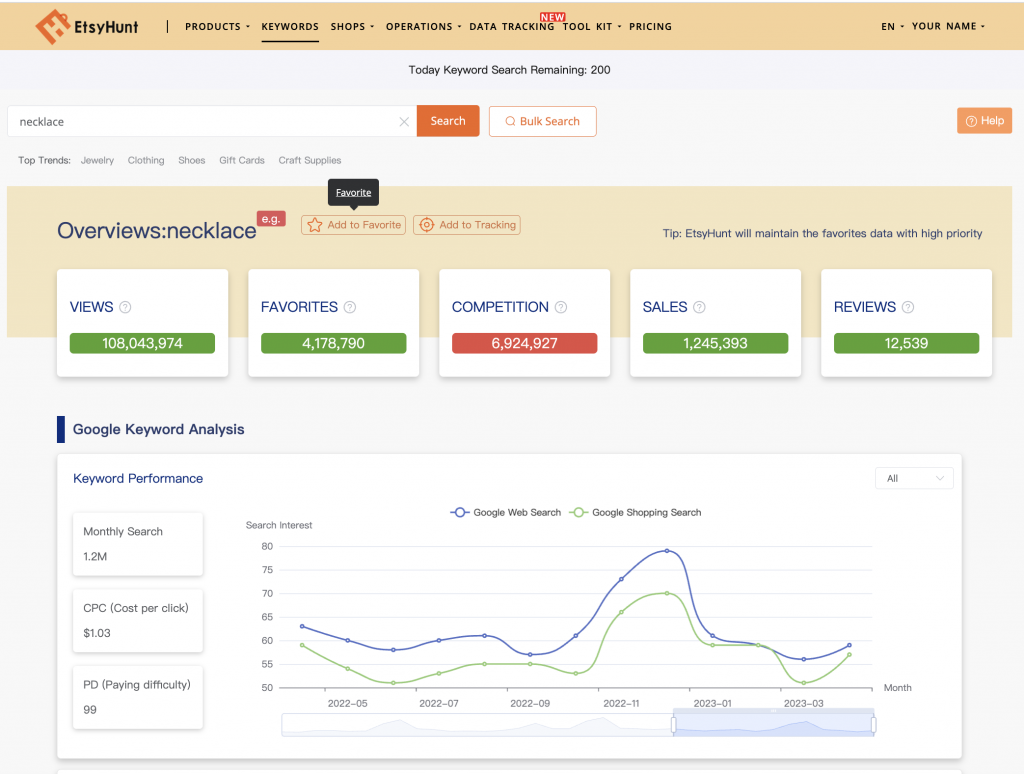 小提示:如果您对某个关键词非常感兴趣,您可以将关键词添加到收藏,EtsyHunt会高优先级维护已收藏的关键词数据。