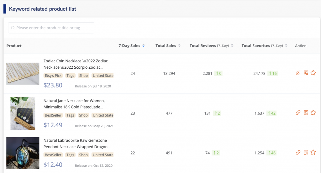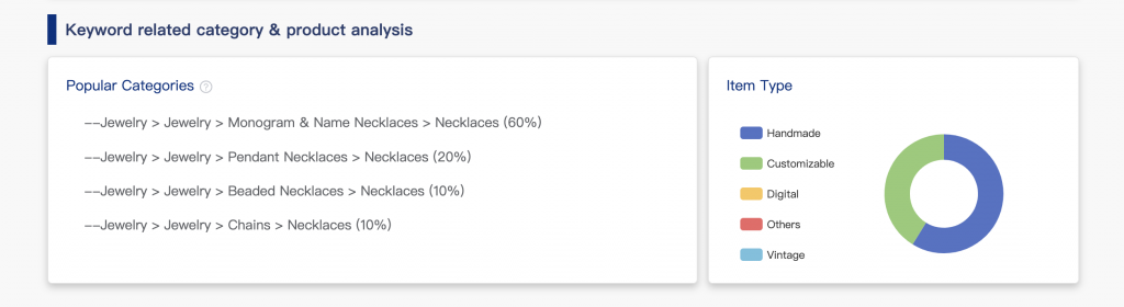 下面来到关键词的核心数据板块,浏览量和收藏数反映了市场需求如何,数值越高,意味着需求越大;竞争度反映了Etsy平台上有多少跟此关键词相关的商品,数值越高,意味着面临的竞争越大;而通过销量可以判断销售该类商品的盈利上限情况如何。