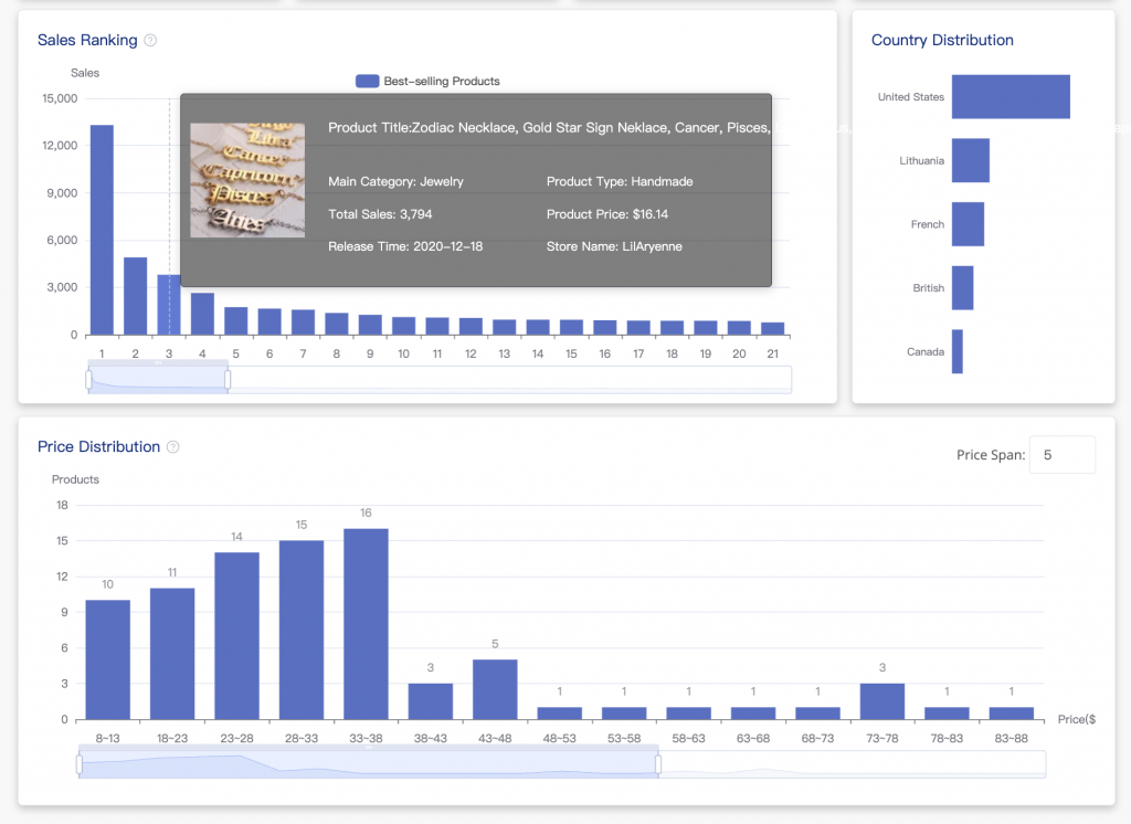 - 销量:使用此关键词的Top100热销商品的总销量之和(请注意,由于Etsy不对外提供销量数据,我们的销量是基于专有算法得到的预估销量,供您参考)